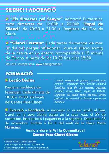 Som un grup de persones laiques que, amb l’acompanyament dels Claretians de Girona, estem compromeses a compartir i difondre el missatge de l’Evangeli, a través de tot tipus d’activitats per a petits, joves i grans. Si voleu saber-ne més ens podeu trobar aquí.